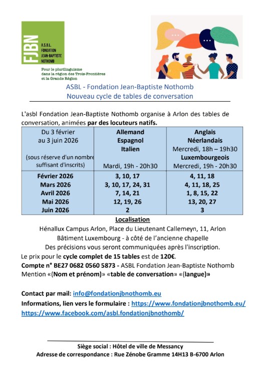 L’asbl Fondation Jean-Baptiste Nothomb lance un nouveau cycle de 15 tables de conversation, en six langues: allemand, anglais, espagnol, italien, luxembourgeois, néerlandais (sous réserve d’un nombre suffisant d’inscriptions).